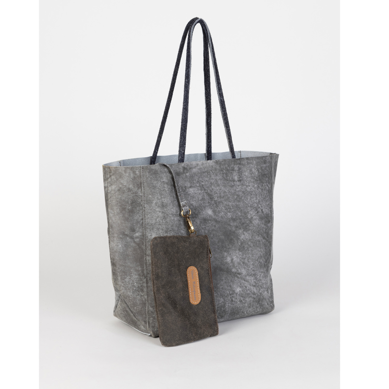 A grey leather shoulder bag with blue leather handles, designed for effortless everyday use. Spacious and easy to carry, it includes a removable inner pouch made of vintage brown leather that offers extra practicality and secure storage for essentials.