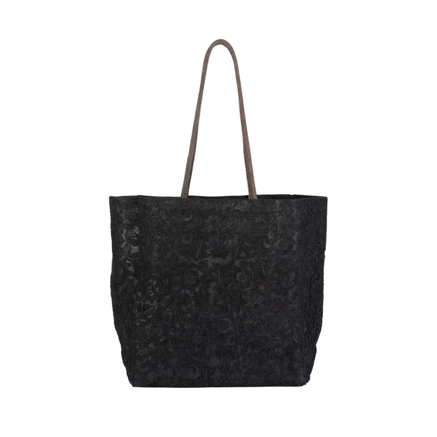 A shoulder bag made of black textured leather with vintage leather brown handles, designed for effortless everyday use. Spacious and easy to carry, it includes a removable inner pouch made of brown vintage leather that offers extra practicality and secure storage for essentials.