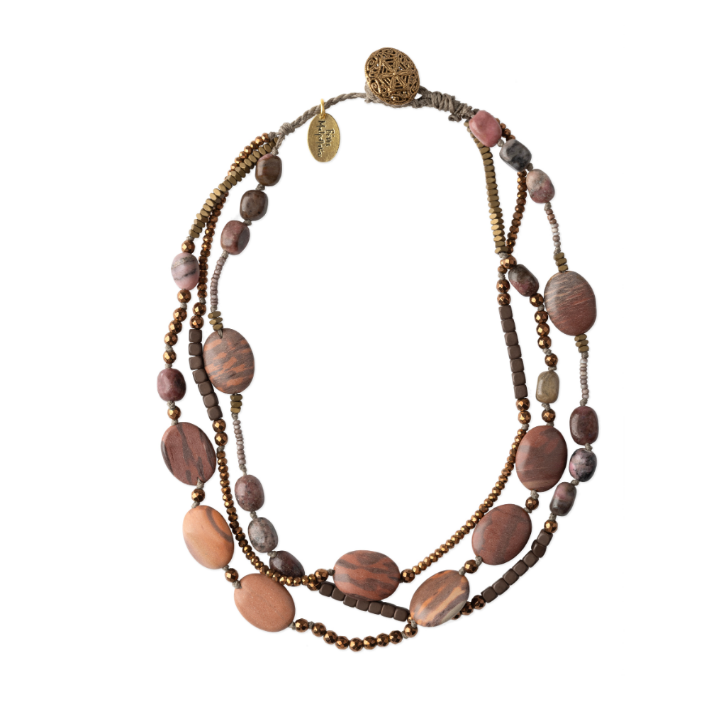Featuring rhodochrosite and triple hematite beads, this necklace is carefully tied with cord to create an authentic, earthy texture. An old metal clasp adds a vintage touch, giving the piece unique character and charm.