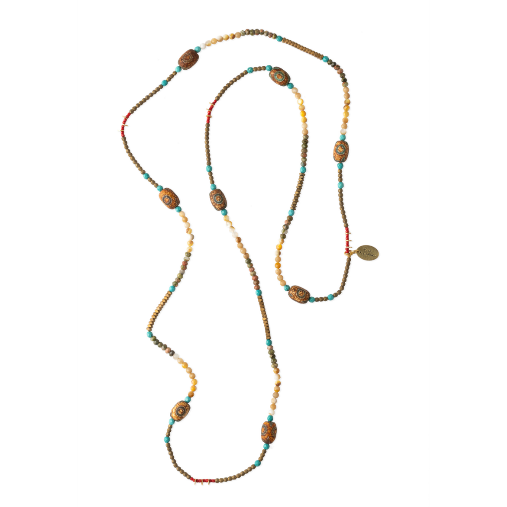 A versatile long necklace featuring a vibrant mix of turquoise, hematite, coral, citrine, and ceramic beads, accented with subtle silver elements. Designed to be worn long or doubled as a shorter layered necklace, this piece combines color, texture, and versatility—perfect for everyday wear or adding a statement to any outfit.