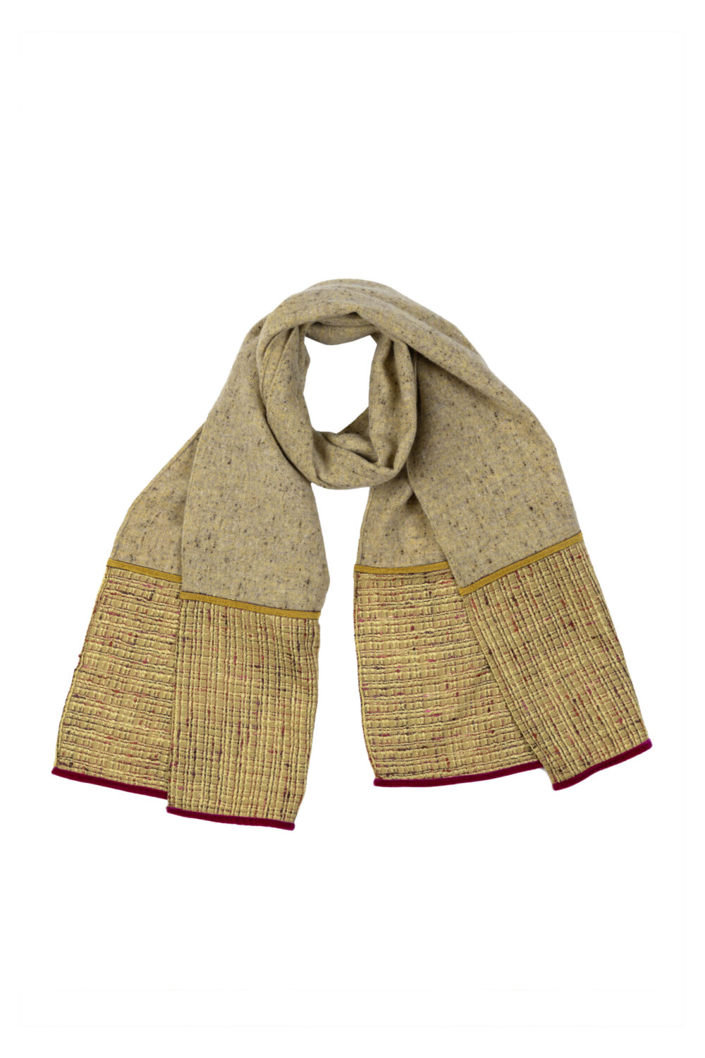 Oversized scarf crafted from diagonal wool bouclé, layered with rich blue velvet for a luxurious mix of textures. Finished with mustard taffeta trim, it brings a playful, bohemian touch to a cozy, statement-making accessory. Perfect for layering and adding color and depth to any outfit.